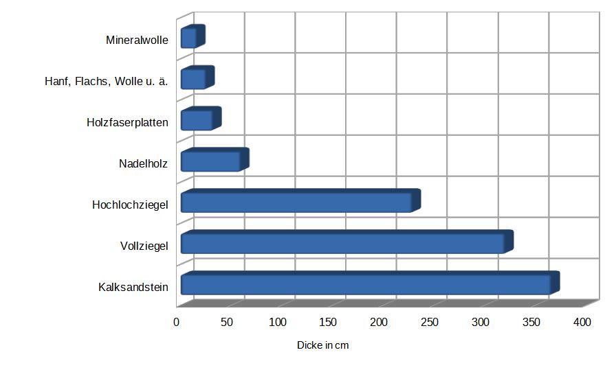 Das Ergebnis ist recht verblüffend: Während verschiedene übliche Dämmstoffe recht nahe beisammen liegen, ist bereits bei Holz eine Wanddicke von etwa 60 Zentimetern für die gleiche Isolationswirkung notwendig. Für energetisch recht hochwertige Hochlochziegel steigt die theoretisch notwendige Dicke dann schon auf über zwei Metern, bei Vollziegeln noch mehr.